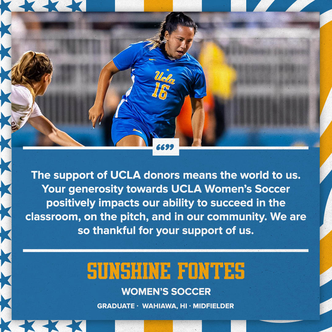 Welcome to the UCLA Athletics Day of Giving! Your generosity toward UCLA Women's Soccer helps provide invaluable support. Every gift has a positive impact on their ability to succeed in the classroom, in competition, and in the community. Gifts of $8 or more will count toward our Day of Giving team competition.