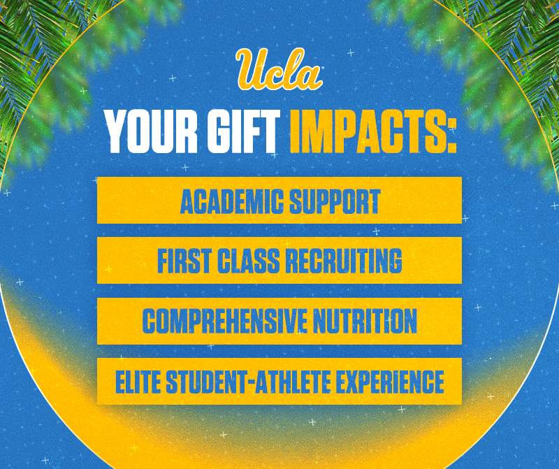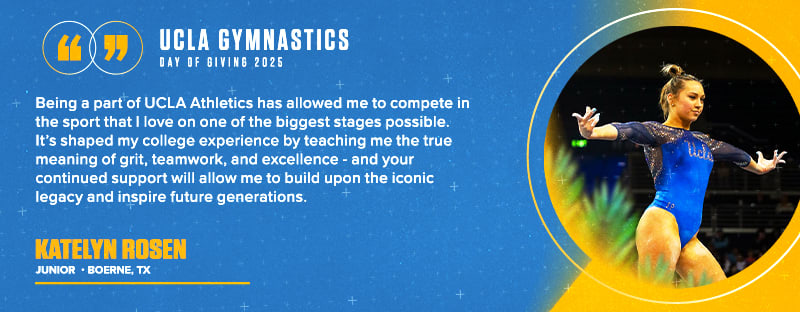 Welcome to the UCLA Athletics Day of Giving! Your generosity toward UCLA Gymnastics helps provide invaluable support. Every gift has a positive impact on their ability to succeed in the classroom, in competition, and in the community.