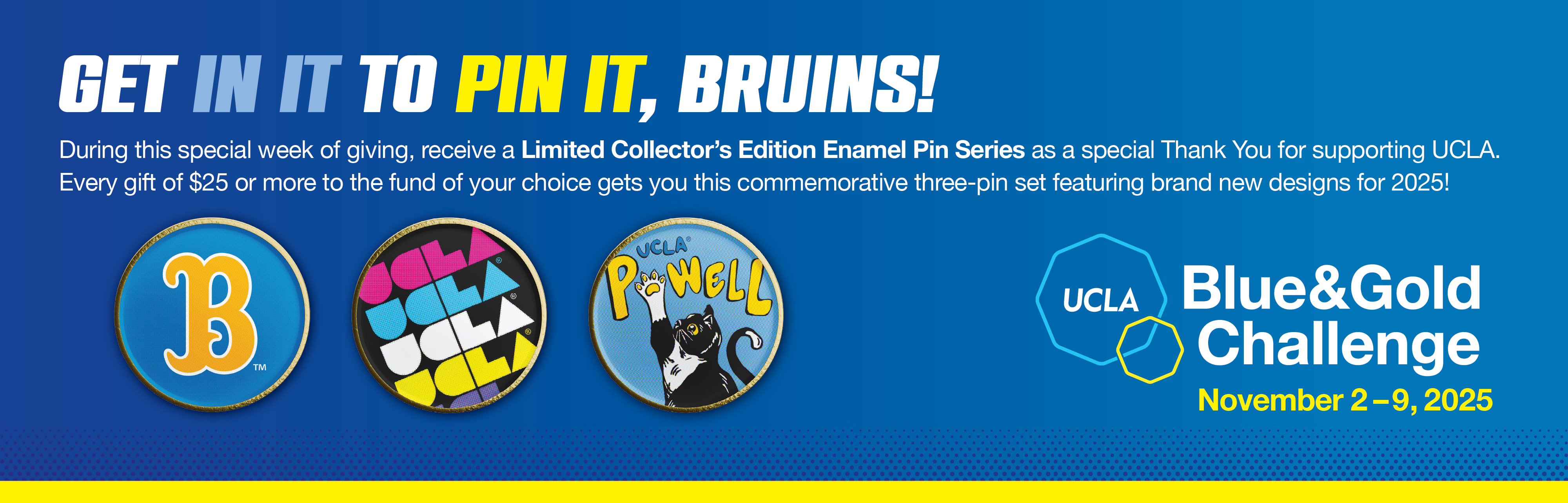 Show your Bruin spirit during the UCLA Blue & Gold Challenge! Gifts made this week (11/2 - 11/9) count towards the challenge goal. To show our appreciation, we will send you a Limited Collectors Edition Enamel Pin Set. (tax-deductible gift of $20).
