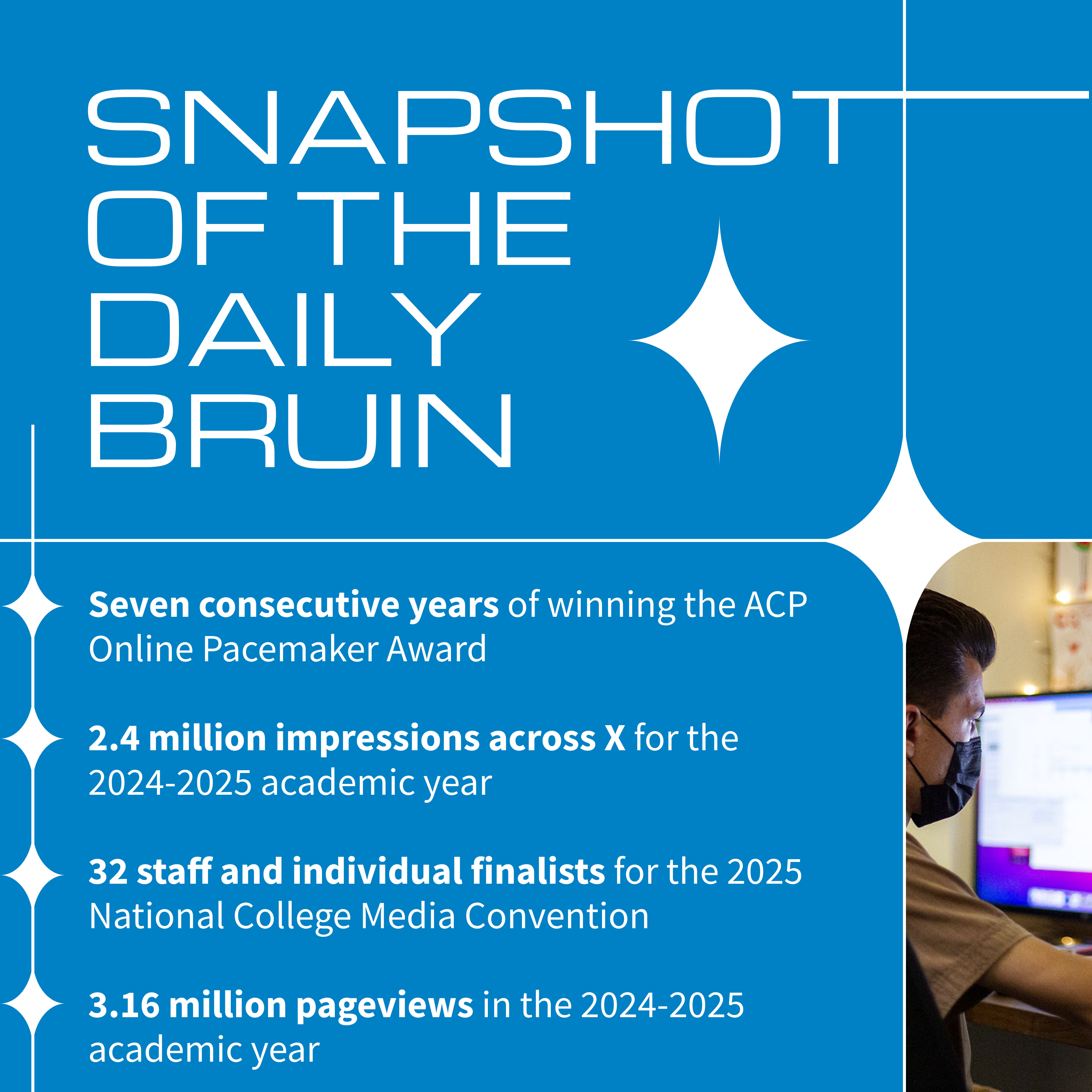 The Daily Bruin has served for more than a century as the paper of record of Westwood and the essential training ground for UCLA students interested in journalism and careers in the media. Generation after generation, The Bruin has produced award-winning journalists and media professionals of distinction.