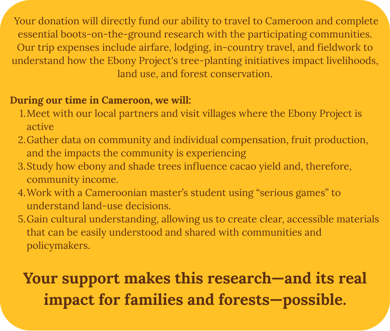 We will proudly acknowledge you as a crucial sponsor of our project during our final research presentation. In addition, you will receive our behind-the-scenes in Cameroon video (and a shoutout for being a donor), a handwritten thank you card, and a Congo Basin Institute t-shirt. We are deeply grateful for your generous contribution and want to thank you for your vital role in supporting our research! (Tax-Deductible Donation of $480)